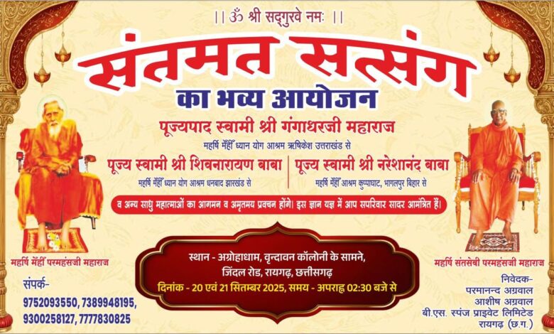 बी.एस स्पंज प्राइवेट लिमिटेड रायगढ़ के द्वारा शहर के अग्रोहा धाम रायगढ़ में 20 सितंबर ओर 21 सितंबर को दो दिवसीय भव्य संतमत सत्संग का भव्य आयोजन किया जा रहा है। संतमत सत्संग में पूज्यपाद स्वामी श्री गंगाधरजी महाराज
