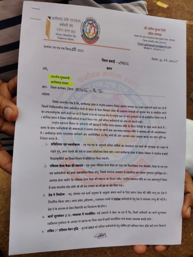 छत्तीसगढ़ प्रदेश एन.एच.एम. कर्मचारी संघ ने सौंपा ज्ञापन